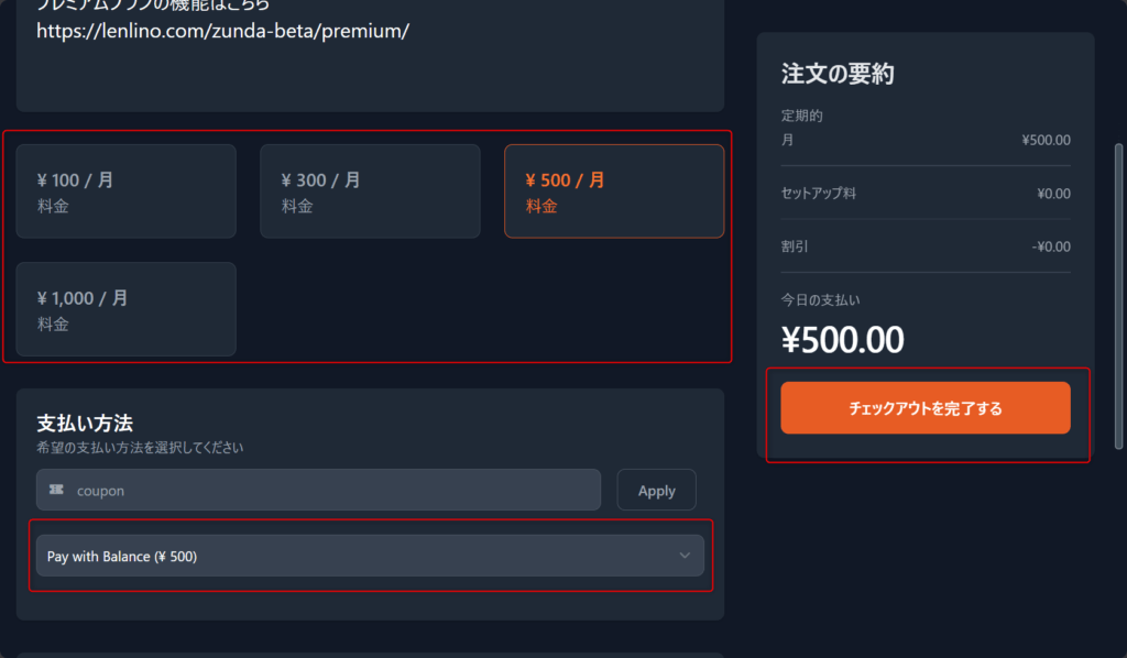ずんだもんβのサポートサーバーの #アクティベート のプレミアムプラン登録ボタンを押します。
