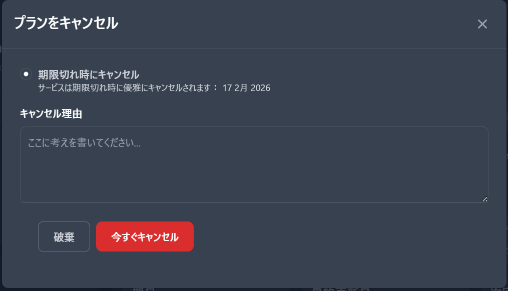 プレミアムプラン登録ボタンの隣のプレミアムプラン解約ボタンを押し、cancelと入力後送信ボタンを押せば解約できます。